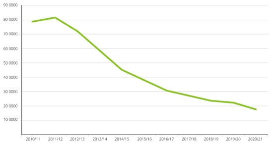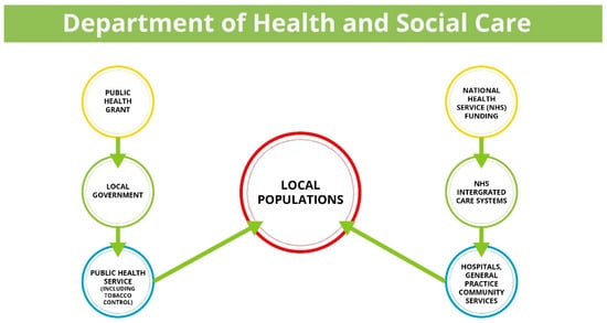 The NHS, introduced in 1948, provides healthcare that is universal, comprehensive, and free at the point of delivery, funded by general taxation []. Each of the four nations of the UK determine their own NHS structure, health policy, priorities, and the degree of integration between health and social care. Treatment for tobacco dependency was recognised as a major pillar of tobacco control by the Royal College of Physicians (RCP) in the middle of the last century [], and despite the availability of medicinal nicotine replacement therapy in the 1980s, it was not until the UK government white paper “Smoking Kills” was published in 1998 that “Stop Smoking Services” were funded and set up across England []. These new NHS Stop Smoking Services used evidence-based guidelines [] to provide a combination of behavioural support and pharmacotherapy to treat tobacco dependence. Smoking cessation practitioners were trained utilising the newly commissioned National Centre for Smoking Cessation and Training (NCSCT), which also provided resources on treatment models that were applicable to both NHS and community settings []. The National Institute of Health and Care Excellence (NICE), the body tasked with producing evidence-based guidelines and quality standards, and designed to improve outcomes for patients accessing NHS care [], produced several smoking-related clinical guidelines [,,,,,] that supported the application of evidence-based treatment and commissioning decisions to fund NHS Stop Smoking Services. However, the responsibility for public health, including tobacco dependency treatment services, was transferred from the NHS in England to local government in 2013 []. Public health services provided by local government are funded by the Department of Health and Social Care (DHSC) through the “Public Health Grant” (Figure 1) []. Between 2015–2016 and 2020–2021 NHS budgets have grown by 3% per capita, in contrast to cuts in the Public Health Grant of 24%, with a disproportionate reduction in tobacco control spending by local government during this period []. At their peak in 2011/2012 NHS Stop Smoking Service treated 816,444 people; however, use of these services dropped to 178,815 in 2020/2021 [] (Figure 2). The explanation for the reduction in use of these services is multifactorial and may include funding cuts to local government stop smoking services [], reduction in national mass media promotional campaigns [], disjointed referral and treatment pathways between NHS and local government services [], the disinvestment in regional and subregional tobacco control alliances [], and the use of e-cigarettes to support self-motivated quit attempts [].