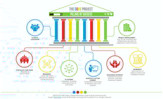 Greater Manchester, a region in the North-West of England, has implemented a vanguard programme of hospital-based tobacco-dependency treatment services. The Greater Manchester CURE project (Conversation-Understand-Replace-Experts/Evidence-base) aimed to translate the OMSC and RCT evidence into a resilient, sustainable, and scalable real-world clinical service model. The service consisted of three key components. First, the service aimed to change the culture across the hospital system and place the key responsibility for the initial management of tobacco dependency in the hands of the admitting clinical team. The word ‘CURE’ was chosen specifically to medicalise tobacco dependency and focus the clinical teams on disease management. Specific CURE e-learning modules were developed to educate staff in the pathology of tobacco dependency, delivery of very brief advice, assessment of level of dependency, and to present a standardised prescribing protocol for patients that smoke admitted to the hospital. Very brief advice (VBA) is a short healthcare professional-delivered intervention that focuses on the offer of help, rather an instruction to stop smoking, and centred on three components: ask, advice, and act. During VBA, the healthcare professional identifies that a person smokes, advises that the best chance of stopping smoking is with the help of medications and specialist support, and then provides access to the medication and support. The prescribing protocol provides combination Nicotine Replacement Therapy (NRT) mapped to the level of dependency and recommends all patients that smoke are offered varenicline in conjunction with the NRT. In addition, standardised teaching sessions covering the same areas were delivered across the hospital during the launch, to support the e-learning package. The CURE e-learning modules were uploaded to the Hospital’s employee training platform (the learning hub) and were recommended to all staff to complete. The e-learning modules covered the background knowledge and pathology of tobacco dependency, how to deliver VBA, the standardised prescribing protocol, and provided video examples of consultations in different hospital settings between healthcare professional and patients that smoke, illustrating these interventions. Over one thousand staff members completed the training during the pilot. The e-learning modules were also made available to any healthcare professional via The CURE website, which provided certification on completion (https://thecureproject.co.uk/training/, accessed on 12 April 2022). The electronic patient record system was designed with new functionality to deliver a specific workflow, where smoking status was recorded for all patients on admission. If a patient was identified as a current smoker, the system provided prompts to deliver VBA and pharmacotherapy and record the completion of this. It also delivered an automated referral to the CURE team (opt-out referral pathway). Following the delivery of the admission bundle of VBA and pharmacotherapy by the admitting team, the CURE team (a team of specialist pay band level six tobacco dependency nurses) will approach every smoker and offer a review of pharmacotherapy, specialist behaviour change support, and motivational interviewing. A key part of this specialist consultation is also offering and agreeing a treatment and support plan after discharge. The CURE team offered ongoing medications and support following discharge, through regular outpatient consultations (face to face or telephone) for 12 weeks.