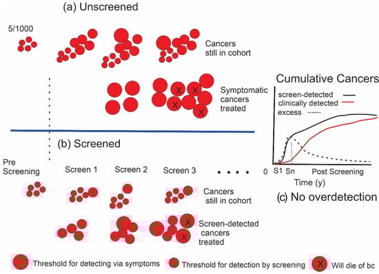 (a) Illustrates the initiation and growth of breast cancers in an unscreened population (e.g., 1000 women). Size of the lesion is represented by the diameter of the discs. X indicates cancers that will result in death. (b) The effect of screening. In (a,b), the lower rows indicate cancers that have been detected and treated, while upper rows show cancers in the cohort that have not yet been detected. (c) Difference (excess) in the cumulative number of cancers found in screened (black curve) versus unscreened (red curve) individuals, depicted in the graph as the dashed line, increases during the period of screening. In this example where there is no overdetection, cancers are found and treated earlier in the screened group; however, after screening ends at Sn, the number in the unscreened group will catch up over time, eliminating the excess.