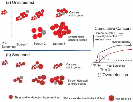The overdiagnosis of breast cancer has been suggested by some to be the largest harm associated with breast cancer screening [,,,]. Overdiagnosis refers to the diagnosis of breast cancers that normally would not have appeared in a woman’s life, i.e., had not caused harm, before she had died of some other cause. In the case of breast screening, this would come about because of the smaller threshold in lesion size (and presumably development) provided by the screening modality. This provides lead time, and it is this lead time that contributes to the reduction in mortality and morbidity that has been demonstrated in women who participate in screening compared to those who do not [,]. If cancers detected earlier through screening would not have surfaced or done harm if they had remained undetected, then they can be considered to have been overdiagnosed, or more correctly, overdetected [], a term that will be used throughout the remainder of this article when referring to detection by screening, while “overdiagnosis” will be used to refer to pathologic assessments.