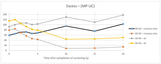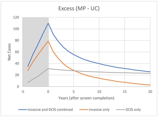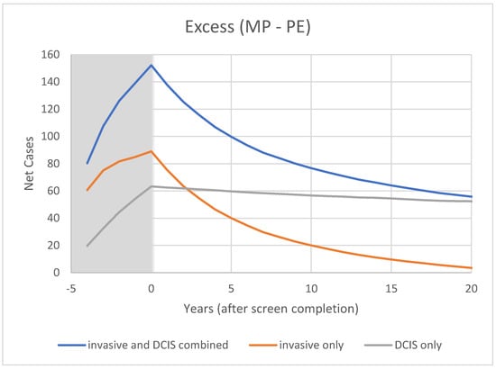 In CNBSS2, for invasive cancers, the behavior over time is as would be expected with the excess gradually diminishing over the first 10 years after the period of screening as cancers gradually surface (without the benefit of screening lead time) in the control group. When the in situ cancers are included, the absolute excess that they represent at t = 0 appears to persist over time.