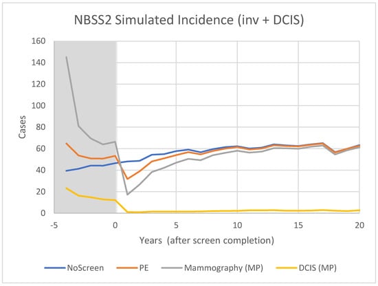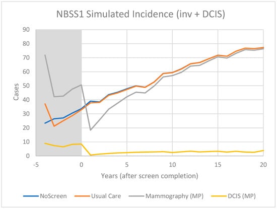 For CNBSS1, at the onset of screening (−4 y), the model predicts a sharp increase in incidence in the arm screened with mammography corresponding to the detection of cancers whose state of development exceeded the threshold for screen detection, but had not yet reached that required to surface symptomatically. Once this “prevalence” screen has occurred, the predicted incidence rates are lower because many of the cancers that had accumulated prior to the onset of screening have been removed from the pool for detection. It might be expected that if there are slow growing or indolent cancers present these would largely be found in that initial prevalence screen along with newer, more aggressive cancers.