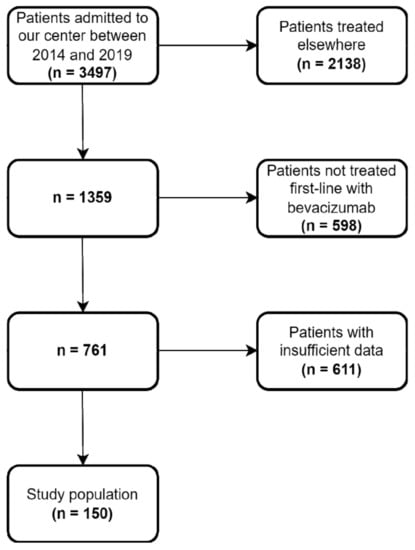 A total of 150 mCRC patients undergoing first-line chemotherapy concomitant with bevacizumab between 2014 and 2019 were included in the analysis (Figure 1). The median age of the patients was 64 ± 9.6 years. Most of the tumors (67%) were located on the descending colon. Mutations in the RAS (KRAS, NRAS) and BRAF (V600E) genes were present in 60 patients out of the 107 for whom these data were available. The most common site for metastasis was the liver (63%), followed by the lung (17%) and bone (5%), while 51 patients presented more than one site of metastasis. The median follow up was 27 months. Baseline patient disposition and disease characteristics according to proteinuria are summarized in Table 1. There were no significant differences between groups in terms of gender (p = 0.25), age (p = 0.28), cardiovascular comorbidities (p = 0.58), diabetes (p = 0.47), primary tumor location (p = 0.44), or associated chemotherapy regimen (p = 0.97).