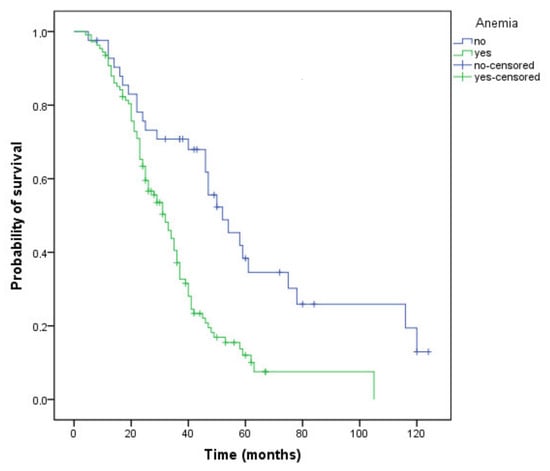 Kaplan–Meier curve of overall survival for patients who have or have not developed anemia during treatment (OS, 32 versus 52 months, p < 0.001).