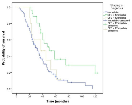 Kaplan–Meier curve of overall survival depending on the stage at diagnosis: metastatic or non-metastatic: DFS (disease-free survival) less or more than 12 months (OS, 31 versus 37 versus 50 months, p = 0.002).