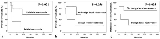 In MGCT patients, 5-year overall survival rate (OSR), local recurrence-free survival rate (RFSR), and distant metastasis-free survival rate (MFSR) were 61.9%, 66.7%, and 58.3%, respectively. The analysis of potential prognostic factors for OSR, RFSR, and MFSR are presented in Table 3, Table 4 and Table 5, respectively. The difference in OSR according to initial metastasis (yes versus no) showed statistical significance (p = 0.021) and, depending upon the benign local recurrence of GCTB (yes versus no), showed a trend toward significance (p = 0.056). None of the potential factors had any impact on the RFSR. The difference in MFSR depending upon benign local recurrence (yes versus no) was significant (p = 0.035) (Figure 1).