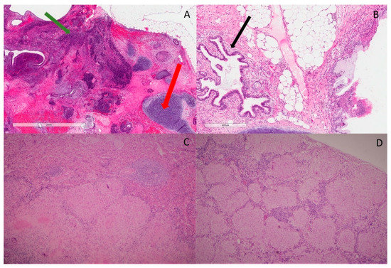 Histopathological features. (A) H&E slide ×20 magnification shows area of immature teratoma comprising primitive neuroectodermal elements (green arrow). There is surrounding cartilage, which represents part of mature teratoma (red arrow); (B) H&E slide ×20 magnification shows benign glands’ architecture (black arrow) with fibroblasts, fat and a small portion of cartilage in the background. No immature teratoma is identified; (C) H&E slide ×40 magnification shows large granulomas with epithelioid and Langerhans’s giant cells, focally with central hyalinization and necrosis in sections of spleen. Mycobacterial and fungal stains are negative; (D) H&E slide ×40 magnification shows well-formed, noncaseating granuloma with few surrounding lymphocytes in porta hepatis lymph nodes.