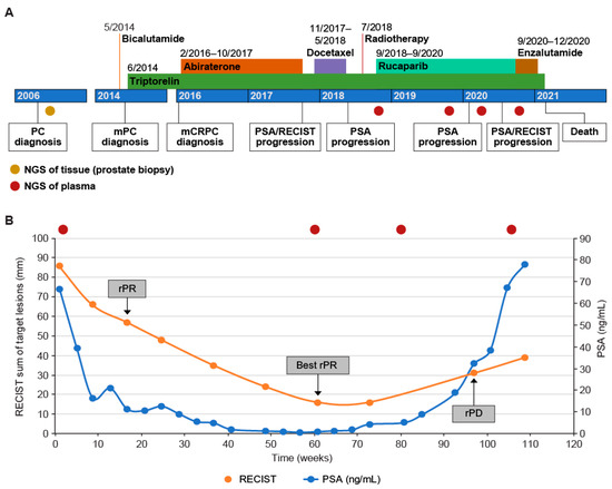 (A) The clinical course of the patient, and (B) the evolution of PSA and tumor measurements per RECIST with rucaparib. mCRPC, metastatic castration-resistant prostate cancer; mPC, metastatic prostate cancer; NGS, next-generation sequencing; PC, prostate cancer; PSA, prostate-specific antigen; RECIST, Response Evaluation Criteria In Solid Tumors, version 1.1; rPD, radiological progressive disease; rPR, radiological partial response.