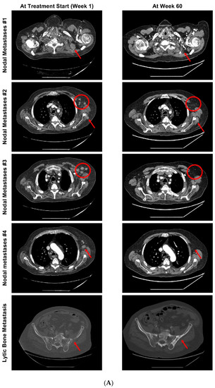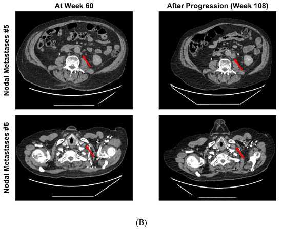 (A) Initial tumor scans (at start of rucaparib treatment) compared with scans at the time of best response (week 60 of rucaparib treatment) of nodal metastases and lytic bone metastases at the target lesions. (B) Scans at the time of best response (week 60 of rucaparib treatment) compared with scans after radiographic progression.
