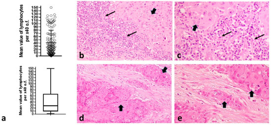 TILs in HNSCC: (a) Distribution of TILs per ×40 o.f. among 121 tumors (showing also the mean value and standard deviation), complemented by a box and whiskers figure showing the median value, range and the 25th and 75th percentile positions. Bars show the median value and standard deviation; (b,c) Typical hematoxylin and eosin sections of HNSCC in ×20 and ×40 magnification, respectively, showing intense infiltration of the tumor stroma by TILs; (d,e) Typical hematoxylin and eosin sections of HNSCC in ×20 and ×40 magnification, respectively, with lack of infiltration of the tumor stroma by TILs. Thin arrows show lymphocytes, while thick arrows show cancer cell nests. (HNSCC = squamous cell head–neck tumors, o.f. = optical fields, TILs = tumor-infiltrating lymphocytes).