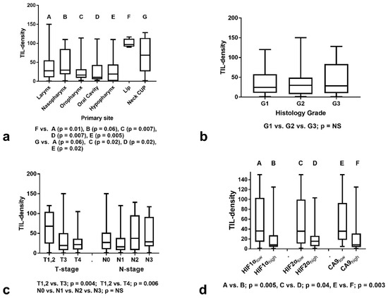 TIL density (mean value of lymphocytes per ×40 o.f.) stratified for histopathological and immunohistochemical variables: (a) Stratification according to primary tumor location; (b) Stratification according to histology grade; (c) Stratification according to T- and N-stage; (d) Stratification according to HIF1α, HIF2α, and CA9 expression groups. Box and whiskers graphs display the median value, range, and 25th and 75th percentile values. (TIL = Tumor infiltrating lymphocyte, CUP = cancer of unknown primary, G = histology grade, HIF1α = hypoxia inducible factor 1α, HIF2α = hypoxia inducible factor 2α, CA9 = carbonic anhydrase 9, A, B, C, D, E, F, G correspond to the indications shown on x-axis).
