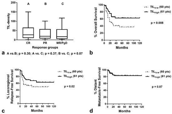 TIL density according to response to RT and Kaplan–Meier survival curves in all patients analyzed: (a) TIL density (box and whiskers graphs show the median value, 25th to 75th percentile and range) in patients with CR, (PR and MR/PgD; (b) Disease-specific overall survival according to TIL density; (c) Locoregional relapse-free survival according to TIL density; (d) Distant metastasis-free survival according to TIL density (TIL = tumor-infiltrating lymphocyte, CR = complete response, PR = partial response, MR/PgD = minimal response/progressive disease, A, B, C correspond to the indications shown on x-axis)).