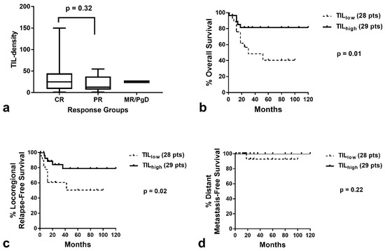 TIL density according to response to RT and Kaplan–Meier survival curves in patients with laryngeal cancer: (a) TIL density (median value, 25th to 75th percentile and range) in patients with CR, PR and MR/PgD; (b) Disease-specific overall survival according to TIL density; (c) Locoregional relapse-free survival according to TIL density; (d) Distant metastasis-free survival according to TIL density (TIL = tumor-infiltrating lymphocyte, CR = complete response, PR = partial response, MR/PgD = minimal response/progressive disease).