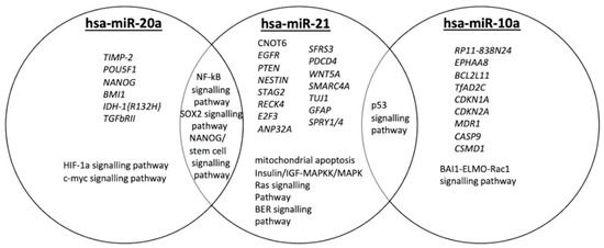 We identified a subset of validated target genes and cancer-related pathways for each miRNA studied (Figure 1), indicating the biological impact of hsa-miR-20a, hsa-miR-21 and hsa-miR-10a in GBM. We found that these three miRNAs have been associated with key molecular processes in GBM, inter alia, angiogenesis, radiosensitivity, cell migration and invasion [7,26,27]. As depicted in Figure 1, hsa-miR-20a, when overexpressed, promotes angiogenesis, cell invasion and cell growth, while hsa-miR-21 plays a key role in invasiveness, radiosensitivity and/or chemosensitivity. hsa-miR-10a overexpression has been observed in epithelial-to-mesenchymal transformation (EMT). Key molecular pathways may be shared among hsa-miR-20a and hsa-miR-21 or hsa-miR-21 and hsa-miR-10a.