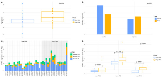A 3-miRNA signature enables standard-of-care treated patients’ stratification to lower (OS > 12 months) vs. higher (OS < 12 months) risk groups: (A,B) Distribution of age and sex in low- and high-risk patients of the age- and sex-matched GBM cohort. The 12 months overall survival was used as threshold, to classify the GBM patients into low- and high-risk groups. Statistical analysis was performed by Wilcoxon signed-rank test. There was no statistical significance between low- and high-risk groups regarding age and sex as indicated by p-value = 0.06 and p-value > 0.50, respectively; (C) MiRNAs, hsa-miR-21, hsa-miR-20a and hsa-miR-10a, expression levels in each individual of the standard-of-care treated GBM cohort, as measured by qRT-PCR. The expression of each miRNA was normalized to the endogenous control, SNORD96A. Data are expressed as ΔCq values. The shaded area includes the high-risk group; (D) Box and whisker plot for the expression of hsa-miR-21, hsa-miR-20a and hsa-miR-10a in the low- and high-risk group of the standard-of-care treated GBM cohort. The dependence of each miRNA when the patients of the low-risk group are compared to those of the high-risk group, was examined by Wilcoxon signed-rank test. The 3-miRNA signature dependence, when the patients of the low-risk group are compared to those of the high-risk group, was examined by two-way factorial ANOVA for independent samples.