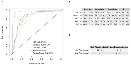 Supervised machine learning algorithms’ performance in discriminating the low- and high-risk group employing miRNA expression values, measured by qRT-PCR: (A) The ROC curves of each model predicting the risk group of the validation set. It illustrates the predictive ability that each model has over true positives and false positives. The area under curve (AUC) is also reported; (B) The table provides the models and the metrics used for their evaluation (sensitivity is the ability of the models to predict the high risk and specificity the ability to predict the low risk). The table summarizes the mean value and the standard deviation of each mode performance over 10 repetitions of the bootstrap method; (C) The mean confusion matrix of the model that scores the best performance on the validation set after 10 repetitions. In the upper left corner of the table, we can see the true positive predictions, and in the lower right, the true negative predictions are depicted.