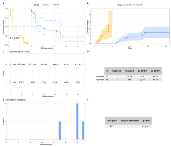 Overall survival probability of the GBM patients according to their risk group: (A,C,E) Kaplan–Meier analyses between high- and low-risk group. The patients were stratified to the aforementioned groups, according to their overall survival. In the y-axis we can see the proportion of patients surviving and the vertical drops in the curve indicate the events. The number of patients at risk and the number of censorings are supplementary to the survival curve; (B) The cumulative events are depicted and indicate the cumulative hazard probability. This is comparable to the integration of the hazard rate of each patient over months; (D,F) Log Rank test for the comparison of the survival curves of the two risk groups. The null hypothesis in this test is that the two curves do not differ. The fact that our p value is below 0.05 indicates that the survival curve of the low-risk group differs significantly from the survival curve of the high-risk group.