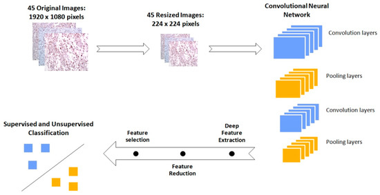 A set of n = 45 IHC images were analyzed to cross-validate that low- and high-risk groups can be discriminated based on antibody detection. Hence, we opted for an image analysis method, which would extract representative features from the entire image and not just textural or structural features from a specific area of the image in question. For this, we employed VGG16, a convolutional neural network (CNN) for feature extraction, as proposed in the studies of Xu et al. and Yonekura et al. [19,20]. More specifically, VGG16 is a pretrained CNN model with 16 layers proposed by the Visual Geometric Group [21]. It was trained with ImageNet, which is a dataset of approximately 1.2 million non-medical images, belonging to 1000 classes. Thus, this model has the ability to extract features from a wide range of images and then classify them. To extract features from our IHC images, we resized them to 224 × 224 × 3, which is the VGG16 input requirement. Subsequently, images advanced on the convolutional layers and features were extracted from the 4th pooling layer of the CNN, creating a 100,352-dimensional feature vector for each image. The whole process was performed in R language using Keras [22] and Tensoflow [23] packages.