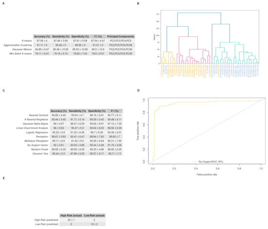 Optimum performance was achieved by the agglomerative clustering algorithm, which reached an accuracy score of 91.11%. Euclidean distance was set as a measure of distance and Ward’s method as the linkage criteria to specify the dissimilarity between clusters. Standard Deviation (STD) values for accuracy, sensitivity and specificity were equal to zero, as it is not a stochastic algorithm. The PCs that led to this result were the 2nd, 5th, 6th, and 38th. Figure 6A depicts how each patient was clustered in a dendrogram plot. Agglomerative clustering, like all the hierarchical clustering methods, works from bottom up by merging the nearest clusters at each step, until there is only one cluster containing all the samples of the dataset [28]. The results of our analyses were initially organized in four clusters: the turquoise, the red, the orange and the cluster containing only the 22nd sample. Following this, two clusters were obtained: one for the orange and the red sub-clusters and another one for the two remaining clusters. In the dendrogram it is apparent that the first cluster represents the low-risk group with four misclassified samples, while the second one represents the high-risk group with only one misclassified sample. Thus, sensitivity rises to 95.46%, specificity to 86.96% and F1 score to 91.01%. The performance of all the clustering algorithms is depicted in Figure 6C. The distribution of the four PCs that yielded the highest accuracy is depicted with box plots in Supplementary Figure S2. Those PCs were also used to train n = 10 supervised algorithms. The performance of each model on the validation set is provided in Figure 6D. The highest mean accuracy score of 92.00% with 3.61% standard deviation was achieved by the Nu-Support Vector classifier and a mean F1 score of 91.72%, with 4.06% standard deviation obtained in the validation set after 10 repetitions. This model’s performance is also illustrated with its ROC curve in Figure 6B, with an AUC = 95%. The mean confusion matrix for this model is given in Figure 6D. The model classifies patients from both groups.