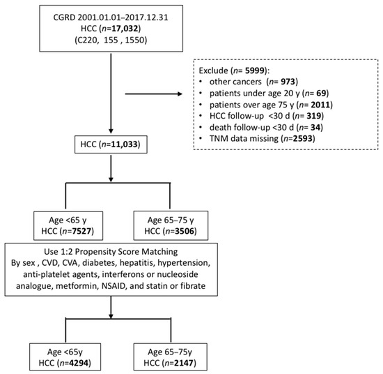 HCC (n = 17,032) retrieved using ICD-9 (155) and ICD-10 (C220) codes (listed in the Table S1) were required to have been diagnosed at least five times in outpatient clinics or once during hospitalization (Figure 1). The drug use duration was at least 84 days in our study according to the reimbursement policy of the National Health Insurance Program, Taiwan. Drug therapy was defined when a patient had more than three outpatient claims. Comorbidities were required to have been diagnosed at least three times in outpatient clinics or once during hospitalization. A total of 7527 patients (<65 years) and 3506 patients (65–75 years) were randomly matched through propensity score matching (1:2) according to sex, cardiovascular disease, cerebrovascular attack, diabetes mellitus, and treatment with metformin or statins. We further added laboratory data related to HCC occurrence, including serum ALT (hepatitis activity), platelet count (liver fibrosis degree), total bilirubin, and prothrombin time (cirrhosis severity), to the matching score. Thus, 4294 patients were included in the younger group, and 2147 patients were included in the geriatric group (laboratory data were not included for PSM).