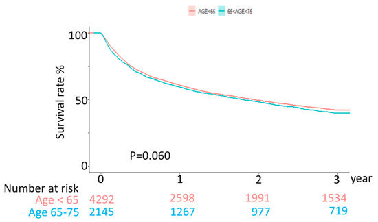 The survival rate was not different between geriatric and younger patients after 3 years, p = 0.1695, based on the Fine–Gray competing risk model after 1:2 PSM (Table 2) and not significant, p = 0.060, based on the Kaplan–Meier model (Figure 2).