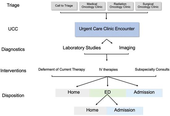 - Bevins, J.S.; Fullington, H.; Froehlich, T.W.; Hobbs, S.; Halm, E.; Lee, S.C.; Hong, A. Safety and outcomes of a cancer patient urgent care clinic. J. Clin. Oncol. 2019, 37, 6542. [Google Scholar] [CrossRef]