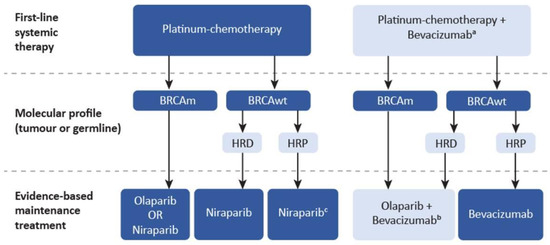 All patients with advanced high-grade EOC who do not harbour a BRCA1/2 mutation and who have a response to first line platinum-based chemotherapy should be considered for maintenance niraparib. If HRD testing is available, patients with HRP disease may have a lower magnitude of benefit from niraparib maintenance. Other treatment options such as observation, participation in a clinical trial, or maintenance bevacizumab can be considered based on patient and disease factors. In the ICON-7 trial, bevacizumab given concurrently with standard chemotherapy demonstrated a significantly prolonged PFS and overall survival compared to standard chemotherapy alone in a subgroup analysis of patients with EOC who had high-risk disease (median PFS: 16.0 months vs. 10.5 months, HR 0.73; 95% CI, 0.61–0.88; restricted mean survival time 39.3 months [37.0–41.7] vs. 34.5 months [95% CI, 32.0–37.0]; log-rank p-value p = 0.03) [57].