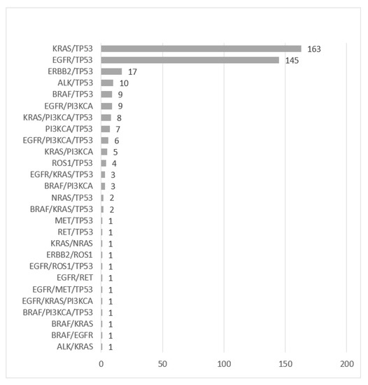 The most common co-mutations identified were in KRAS/TP53 (163, 40.2%), followed by EGFR/TP53 (145, 35.8%), ERBB2/TP53 (17, 4.2%) and BRAF/TP53 (9, 2.2%) (Figure 2).