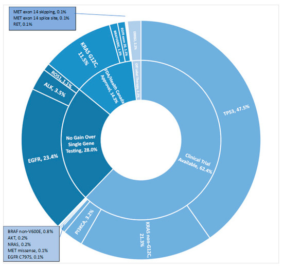 Using TST15, clinically relevant variants were identified for 994 patients (71.3%), including 200 (14.3%) with Health Canada approved therapies, 870 (62.4%) for clinical trial enrolment (www.clinicaltrials.gov, accessed on 13 May 2022), and 30 (2.2%) for off-label treatments (e.g., afatinib or TDM-1 for ERBB2 variants) (Figure 3).