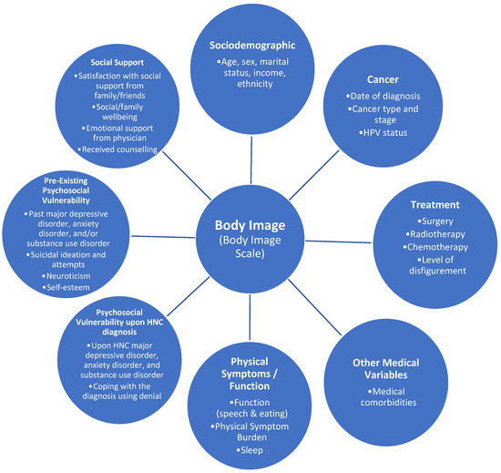 Previous studies have focused on psychosocial factors, such as depression and anxiety, that render certain patients susceptible to body image concerns, mainly using conceptual models that include the moderating roles of coping strategies, patient surgical expectations, and body image investment [13]. Using our HNC-specific model conceptualizing body image as a function of personal vulnerability and contextual stress, it was found that changes in levels of body image concerns may be explained by a host of biopsychosocial factors, including physical markers (i.e., disfigurement, changes in physical functioning, and cancer staging), psychosocial markers (i.e., depression and anxiety, individual differences in coping with denial and avoidance), and social disparities (i.e., age, gender, language, and marital status).