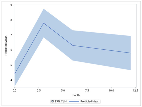 Expected growth curve plotted as a function of months. Note. The predicted means (and 95% Confidence Limits for the Mean) were: T0 = 4.41 (3.57, 5.24), T1 = 7.80 (6.85, 8.76), T2 = 6.31 (5.31, 7.32), and T3 = 5.80 (4.66, 6.94).