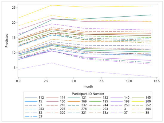 There was also a significant random effect of time, indicating variation in the linear slopes across individuals. Figure 3 exemplifies the predicted individual growth curves to give a sense of this variation. Note that the growth curves differ in steepness, and individuals may enter at different baseline levels.
