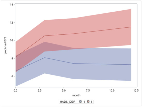 Plot of the Time × Depression interaction as a function of months. Note. The blue line estimates the growth curve of individuals with depression scores −1 SD below the mean and the red line +1 SD above the mean, controlling for other factors. Shaded regions indicate the 95% confidence limits.
