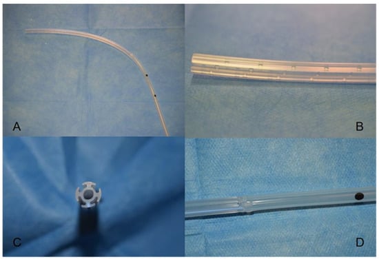 Smart Drain Coaxial tube (A). These tubes consist of four external fluted channels for fluids drainage and an internal section which allows separate air evacuation from appropriate distal bores (B–D).