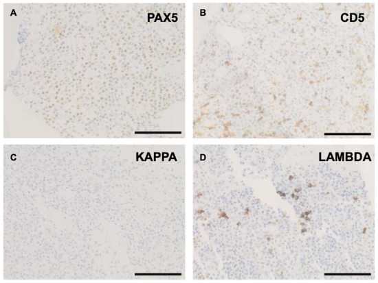 Immunohistochemistry of the initial bone marrow biopsy showing the lymphoplasmacytic lymphoma to be positive for Pax5 (A) and negative for CD5 (B) with a plasmacytic component negative for kappa (C) and positive for lambda (D). (Scale bars = 50 μm at magnification 400×).