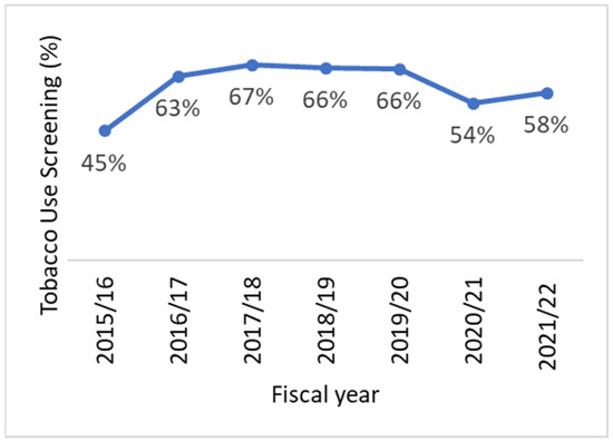 Tobacco use screening rates among new ambulatory cancer patients in Ontario RCCs, by fiscal year, 2015–2016 to 2021–2022.
