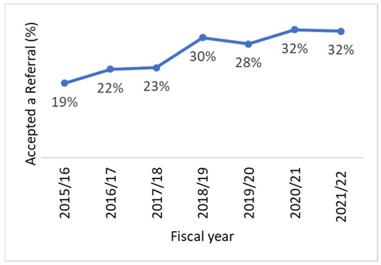 Acceptance of a referral rates among current and recent smokers in Ontario RCCs, by fiscal year, 2015–2016 to 2021–2022.