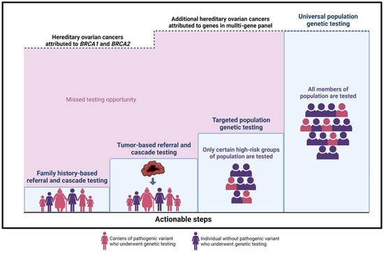 Actionable steps towards hereditary ovarian cancer prevention. The upper dashed line represents the ~20% of hereditary ovarian cancer cases that are attributed to BRCA1 and BRCA2 mutations.