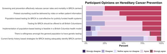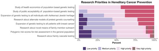 As noted in Figure 2, there is strong support from participants for screening and prevention through population-based testing programs. Respondents reported consistent agreement that preventative interventions effectively reduce cancer rates and morbidity and that population-based testing can be feasible and acceptable to the public. It was noted by more than 75% of participants that current family history-based strategies were ineffective. Figure 3 illustrates participants’ responses about the recommended priority research areas and that key areas of focus are (a) health economics assessment and (b) evaluation of public acceptability.