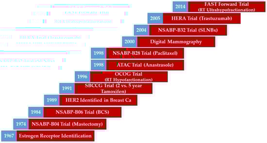 Breast cancer management has evolved over time with notable advances and milestones [1,2,3,4,5,6,7,8,9,10,11,12,13,14,15]. Advances in radiological imaging have refined cancer detection and localization [1]. Enhanced pathological processing and tumour profiling have yielded a more detailed characterization of disease [2,3]. Advances in surgical techniques and approaches have allowed for breast conversation and minimization of morbidity [4,5,6,7,8]. More effective systemic treatment options have resulted in improved survival outcomes [9,10,11,12,13]. Modern radiotherapy techniques have enabled precise dose delivery while minimizing dose to organs at risk [14,15]. Examples of the advances and milestones of breast cancer management over time can be seen in Figure 1.