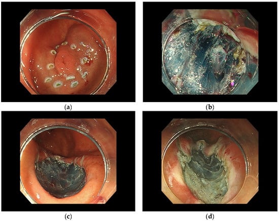 - Goto, O.; Fujishiro, M.; Kodashima, S.; Ono, S.; Niimi, K.; Hirano, K.; Yamamichi, N.; Koike, K. A second-look endoscopy after endoscopic submucosal dissection for gastric epithelial neoplasm may be unnecessary: A retrospective analysis of postendoscopic submucosal dissection bleeding. Gastrointest. Endosc. 2010, 71, 241–248. [Google Scholar] [CrossRef]