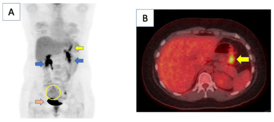 Computed tomography (CT)/positron emission tomography (PET) scan of patient demonstrated moderate focal uptake along gastric body consistent with known malignancy (yellow arrow in panel (A,B)). There was also a large, mildly hypermetabolic right adnexal area with heterogenous uptake concerning for metastatic involvement (yellow circle). Kidneys (blue arrows) and bladder (orange arrow) demonstrate physiologic uptake.