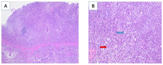 Hematoxylin and eosin staining revealed invasive, poorly differentiated gastric carcinoma invading into the muscularis propriawith minimal gland formation (panel (A),2× magnification). Panel (B) (20× magnification) demonstrates signet ring cell component (blue arrow) as well as pleomorphic neoplastic cells (red arrow).
