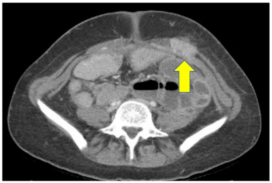Axial CT image of case report patient demonstrated disease recurrence in left abdominal wall (yellow arrow).
