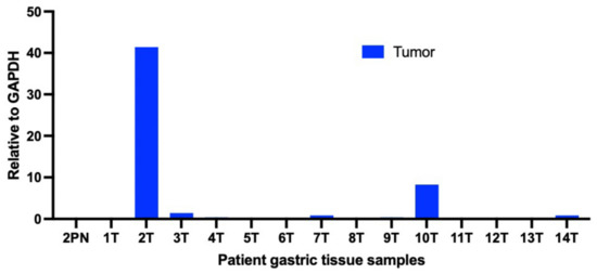 The pathology of the patient tumor showed many neutrophils in the tissue surrounding tumor cells, which led us to examine the expression of C-X-C motif chemokine 5 (CXCL5). Several studies suggest that CXCL5 is a strong neutrophil chemoattractant [16,17,18,19]. In addition, the patient had been treated for H. pylori infection, which is associated with the increased production of CXC chemokines [20]. The goal was to further understand the status of the disease, either indicating the extent of disease severity/malignancy or host immunity to the tumor. Total RNA was isolated from the patient’s gastric cancer tissue and processed for quantitative real-time polymerase chain reaction (qRT-PCR), as described in our previous studies [21,22,23,24], using the Direct-zol RNA mini kit (Zymo Research Corp) according to the manufacturer’s instructions. RNA quality was determined by using a Nanodrop system (Thermo Fisher Scientific, Inc., Waltham, MA, USA) followed by reverse transcription into cDNA using the High Capacity cDNA Reverse Transcription kit (Thermo Fisher Scientific, Inc.). The specific primer pairs used in the study for CXCL5 and glyceraldehyde-3-phosphate dehydrogenase (GAPDH) were as follows: forward 5′-TGGACGGTGGAAACAAGG-3′; reverse, 5′-CTTCCCTGGGTTCAGAGAC-3′ [25] and forward, 5′-CCTGGTCACCAGGGCTGC-3′; reverse, 5′-CCGTTCTCAGCCTTGACGG-3′ (Integrated DNA Technologies, Inc., Clareville, IA, USA), respectively. The expression of CXCL5 for each sample was expressed relative to its GAPDH using comparative cycle threshold calculations (ΔCT, Applied Biosystems, Waltham, MA, USA) and plotted using GraphPad Prism software. Including this case, we examined the expression of CXCL5 in a series of 13 other gastric tissue samples obtained from the UCSD Cancer Center Biorepository and new presenting patients at our center for comparison. All patients provided written informed consent and were followed up. The additional gastric tissue samples for comparison included 13 gastric cancer tumor tissues (T). A summary of all patients and their gastric tumor characteristics, including the case patient (2T), are provided in Table 1. There was very high expression of CXCL5 in the tumor of the case patient (Figure 4). Among the gastric tissue samples we analyzed, only one other sample from an older patient (10T) had significant CXCL5 levels (over 2-fold relative to GAPDH). However, the levels were much lower than the levels observed in the patient described in this case report.