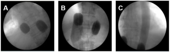 The applied perfusion techniques have been described in detail previously [14,19,20]. To address the primary tumor, mediastinal, lung and cervical metastases an ITP was performed. In total 36 ITPs were conducted. Briefly, RegCTx was performed under general anesthesia and full systemic anticoagulation with heparin. An approximately five cm incision was placed in the groin region and the femoral vessels explored. The vessels were looped with vessel-loops and a venous and arterial three-channel stop-flow balloon catheter was inserted in the inferior vena cava and aorta. Cava catheter was blocked beneath the right atrium, and the aorta was blocked slightly below of the diaphragm plane. Placement was undertaken only under X-ray control. Correct placement of the catheters was documented by cavography and aortography, respectively (Figure 1A–C). The upper arms were blocked by pneumatic cuffs ensuring the isolation of the chest, head, and neck area. Chemotherapy was applied manually with high pulsatile pressure against the aortic blood stream through the coaxial channel of the arterial balloon catheter.