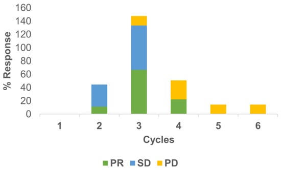 Responses to the treatment have been measured under RECIST criteria. Usually, after two cycles of therapy, a CT scan has been conducted. In total, 22 scans were available for response evaluation. The overall response rate was 41% PR, 27% SD and 32% PD for the RegCTx in the entire cohort and over the entire period of follow-up. Cycle specific response demonstrated best PR and SD after the third cycle and both being declining substantially afterwards. On the other hand, PD was less frequent in the earlier cycles but picked up after the third cycle. Figure 2 depicts the response evaluation.