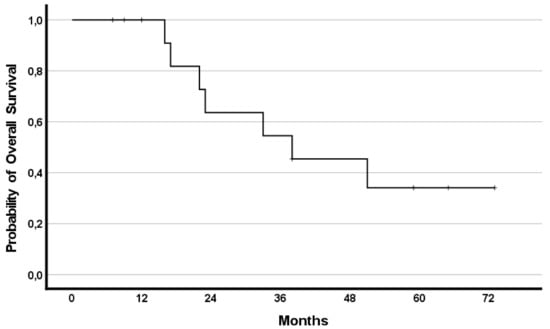 The median OS was 38 months (95%CI 10.1–65.9) with 8 (57%) patients having a survival lasting ≥22 months. Survival rates reached 79%, 50%, and 35% at years one, two, and three, respectively.