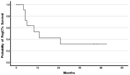 For statistical analysis, SPSS for Windows (Version 28.0) was used. RegCTx specific survival and overall survival (OS) curves of the patients were plotted by using the Kaplan–Meier method and analyzed using the log-rank test. Significant statements refer to p-values of two-tailed tests that were p < 0.05. Results are presented as median survival in months with 95% confidence interval (CI) or if median was not reached with mean values. The OS was computed as the time period from the date of first diagnosis to the date of death or last follow-up, whichever occurred first. The RegCTx specific survival was defined as the time period from the date of first RegCTx to last follow-up or date of death, whichever occurred first. Patients alive at the last follow-up date were censored.