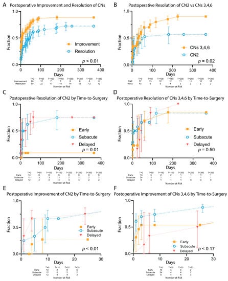 Postoperative Resolution and Improvement of Cranial Nerve Deficits. (A)—Postoperative Improvement and Resolution of CNDs. (B)—Resolution of CN2 vs CNs 3, 4, and 6. (C)—Resolution of CN2 by time-to-surgery cohort. (D)—Resolution of CNs 3, 4, and 6 by time-to-surgery cohort. (E)—Improvement in CN2 by time-to-surgery cohort. (F)—Improvement in CNs 3, 4, and 6 by time-to-surgery cohort.